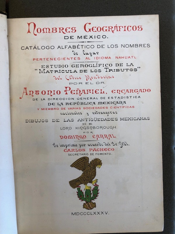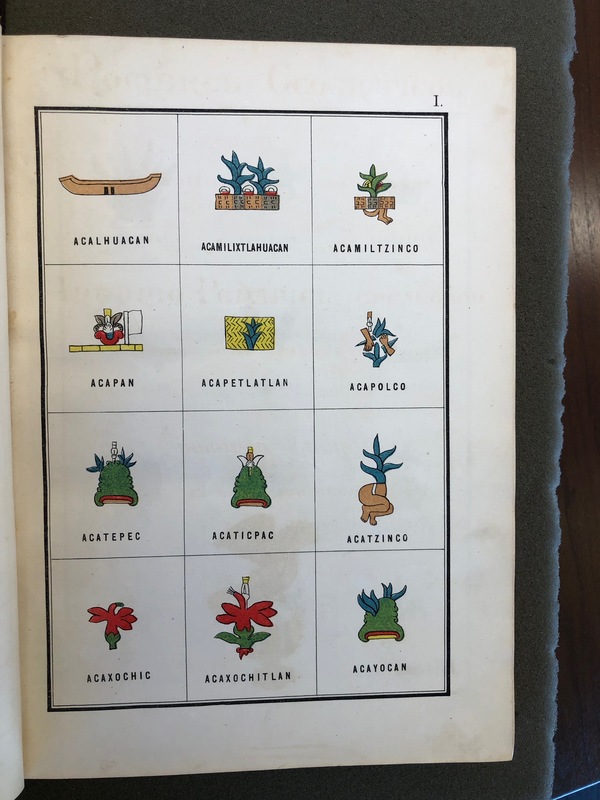 Nombres Geografico de Mexico (Geographical Names of Mexico) was published in Mexico in 1885. It is an alphabetical catalog of places in Nahuatl hieroglyphics. The book begins with the display of alphabetized Nahuatl hieroglyphics and the last section contains Nahuatl hieroglyphics paired with their proper pronunciation and the Spanish translation of the Nahuatl icon. The hieroglyphics pictured in this book come from the Codex Mendoza. The Codex Mendoza contains the history of Aztec rulers, conquests, places, and the lives of Aztec people. Circa 1830s-1848, Lord Kingsborough commissioned a facsimile edition of the Codex, which formed the basis of the 1885 Nombres Geograficos de Mexico.