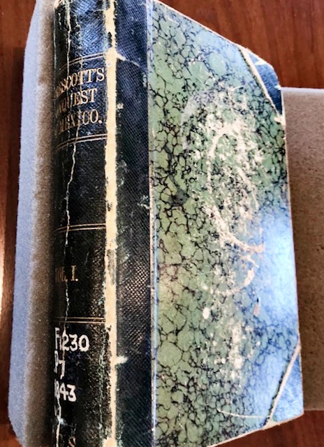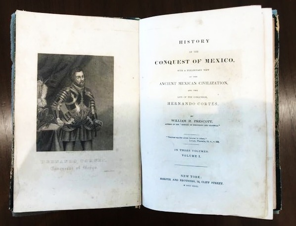 Prescott’s account in this five-hundred-page first volume of three was authenticated by manuscripts taken from the Royal Academy of History in Madrid. Thus, the book itself is important for learning about the dynamics between the indigenous peoples and Spanish foreigners. In the first picture, you can see the multitextured marbled cover with golden embroidery indicating that this book was made with a lot of importance and value, although, its condition is starting to deteriorate. The second image is of the cover page, featuring a portrait of Cortés.