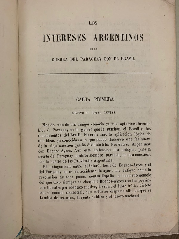 Juan Bautista Alberdi was an important figure in the construction of the 1853 Argentine constitution and was heavily involved in disputes between Buenos Aires and the Argentine provinces. He was exiled in 1847 but was brought back into the fold in 1853 as an ambassador to Chile. Afterwards, he finally settled in Paris, France, where he released this pamphlet of personal letters suggesting ulterior national diplomatic motives for Argentina’s involvement in the War of the Triple Alliance. Alberdi was a strong proponent for supporting the Argentine provinces in their ongoing political battle with the consolidated powers of Buenos Aires, which he draws from in his letters opposing the war. He looks at Paraguay in South America as an analogous entity to the provinces of Argentina who struggle for freedom and trade with the outside world without subjugation or dependence on Buenos Aires. The country was so divided that it did not even officially receive its name “Argentina” until 1962. This internal divide is the great Argentine battle that still afflicts the country today.