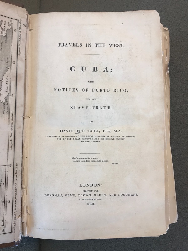 A leading 19th-century abolitionist and the British consul to Cuba, David Turnbull wrote extensively against Spanish colonial practices in concordance with British views on the subject. Turnbull’s Travels in the West, published in 1840, marked the seven-year anniversary of the British Empire’s abolition of slavery. The crown’s language regarding this decision was often self-congratulatory, but Turnbull’s travel narrative displays a unique approach. His text does not overtly market itself as an abolitionist narrative, but the content invariably has that bent. For example, the epigraph, located on the title page, reads “Man’s inhumanity to man / Makes countless thousands mourn. —Burns.” Setting the stage for the rest of the text, the tone of this epigraph offers the reader clues to Turnbull’s, and his patron’s, “The Right Honourable, The Earl of Clarendon, G.C.B.,” stance on abolitionism.