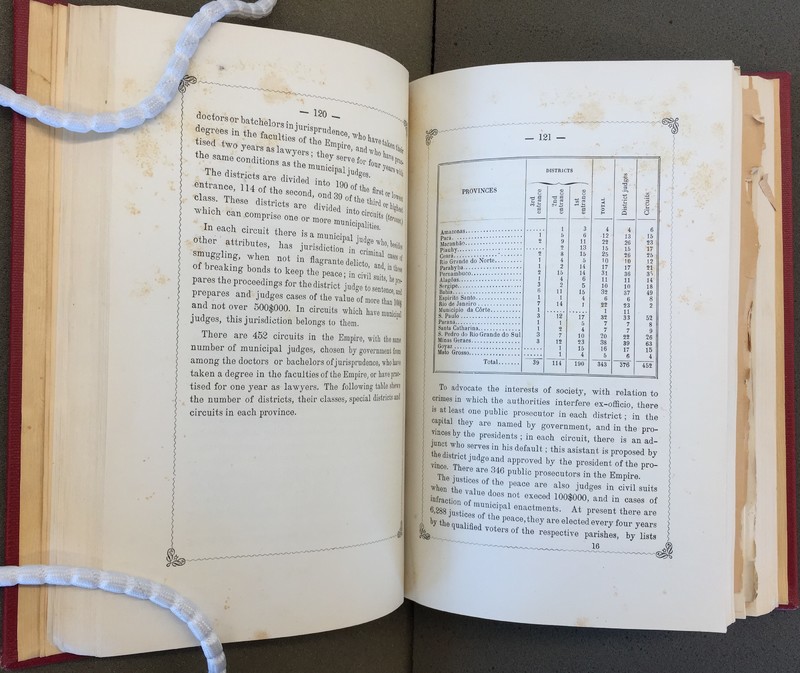 In May of 1876, Brazil sent a delegation to Philadelphia to participate in the World’s Fair, the first to be held in the United States. The delegates carefully curated exhibitions, which prominently featured Brazilian art, music, and literature, and presented Brazilian culture to curious onlookers. The delegation also commissioned this text, aptly titled The Empire of Brazil at the Universal Exhibition of 1876, a guide that introduced many aspects of Brazilian culture and society to North American and European readers. The approximately 500-page volume includes entries on Brazil’s education system, agricultural industry, naval infrastructure, and tables dedicated to demographic statistics (see images). The book’s discussions on such diverse topics reveal the racial and national ideologies that constructed an image of Brazil that the nation wanted to project to the rest of the world.